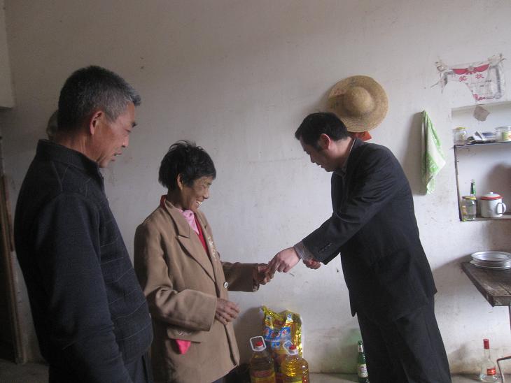黄院长首先带领干警来到村委会,与部分村干部座谈。听取村党支部书记徐自平关于该村今年村级经济发展规划以及对法院工作的意见建议。随后,黄院长来到留守儿童姚贝家中,向残疾女童姚贝赠送了学习用具。听姚贝爷爷、奶奶介绍,姚贝一出生就患有唇腭裂(俗称兔唇),已在北京做过两次修复手术,儿子、媳妇均在武汉打工。71岁的爷爷姚泽民也患了胃癌,70余岁的奶奶卢普莲不仅要照顾患病的老伴,还要照顾年幼的孙女,一家人的生活很困难。黄院长当即从自己的口袋里拿出200元钱,递到姚贝奶奶的手中,并表示,我院还将专题研究帮扶措施。此后,黄院长来到患胆管癌的困难户胡喜莲家中,送上米、油等物资以及200元慰问金。