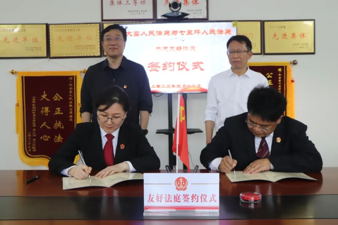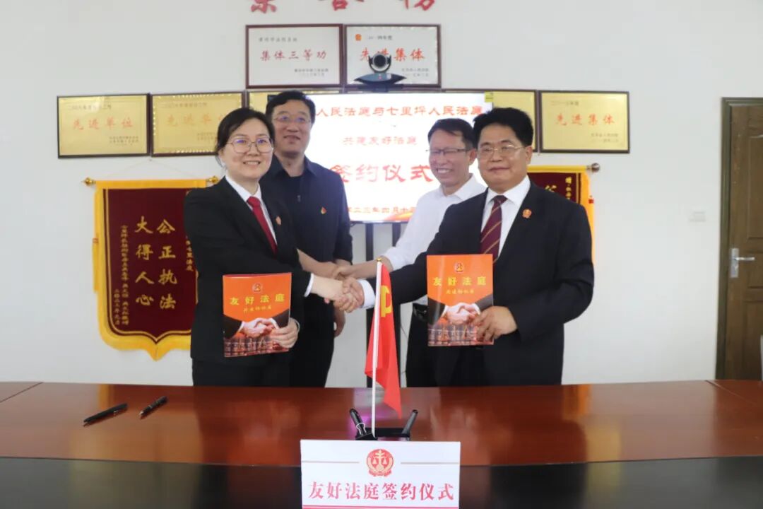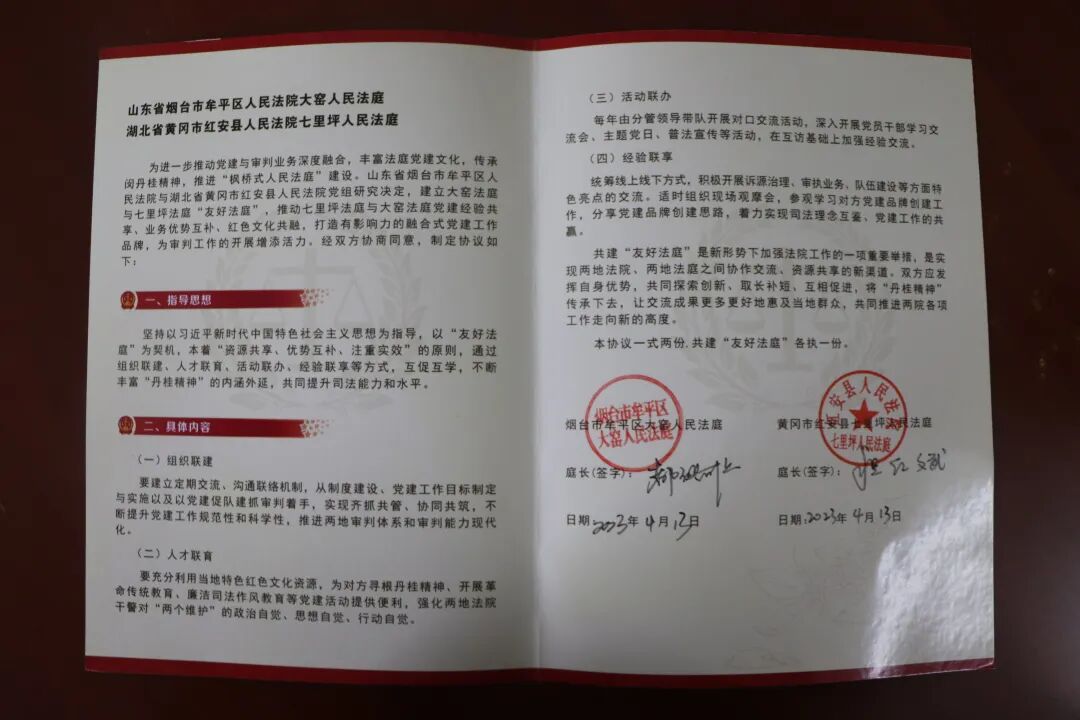 随后,双方在七里法庭党建活动室进行“友好法庭”共建签约仪式。在双方干警的共同见证下,红安法院七里法庭庭长程红斌、牟平法院大窑法庭庭长都皓怡分别在“友好法庭”共建协议书上签名、互换协议书。在双方干警的热烈掌声中,两庭正式结为“友好法庭”。