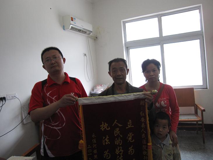 在深入开展政法干警核心价值观暨“喜迎十八大,争创新业绩”主题教育实践活动中,我院执行一庭干警司法为民、廉洁办案,受到当事人的好评。5月31日上午,申请执行人熊某和儿媳及孙子来到我院赠送“人民的好法官、立党为公、执法为民”锦旗一面,感谢执行法官及时帮其执行到位13万余元赔偿款。